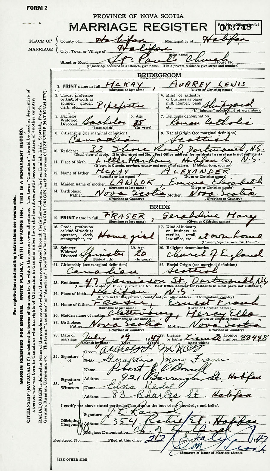 28. Date of marriage July 19 1947 29. By license or banns License 30. License number 88448