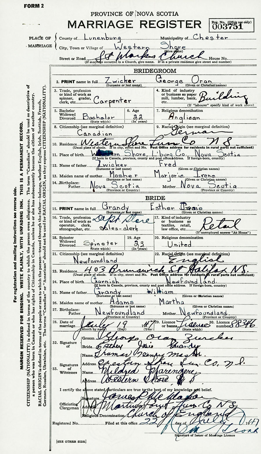 28. Date of marriage July 19 1947 29. By license or banns License 30. License number 88346