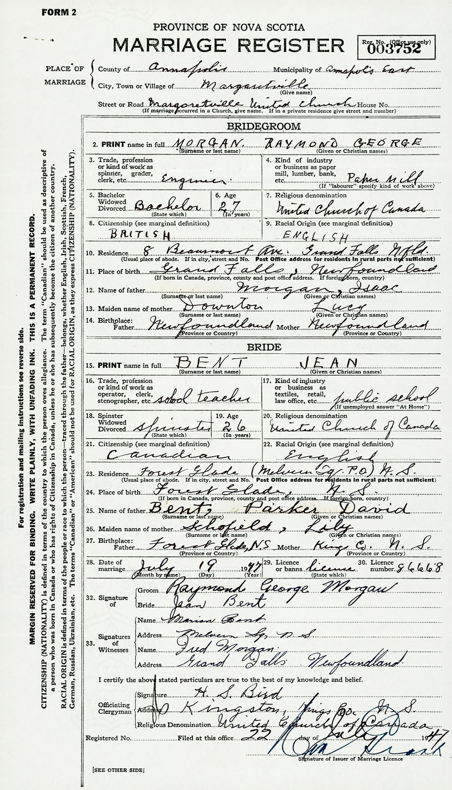 28. Date of marriage July 19 1947 29. By license or banns License 30. License number 86668