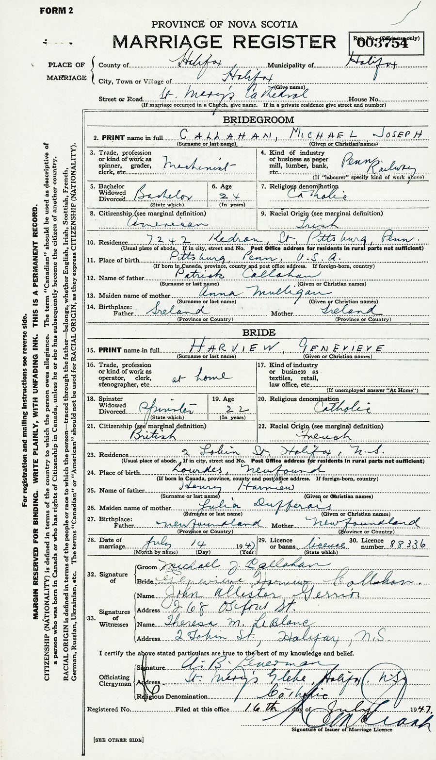 28. Date of marriage July 14 1947 29. By license or banns License 30. License number 88336