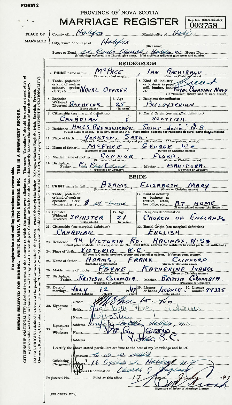 28. Date of marriage July 12 1947 29. By license or banns License 30. License number 88335