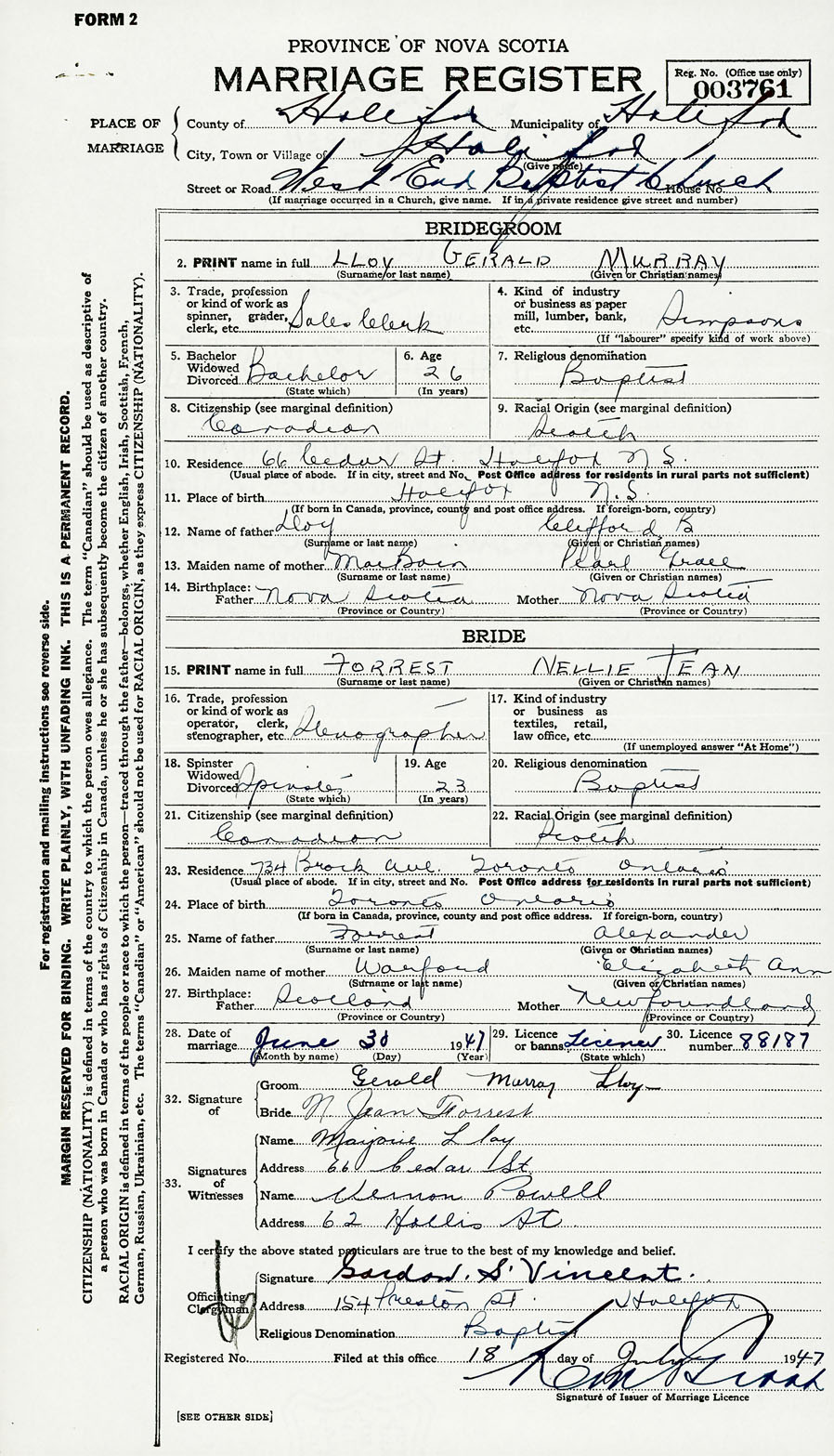 Officiating Clergyman Gordon S. Vincent154 Preston St. Halifax