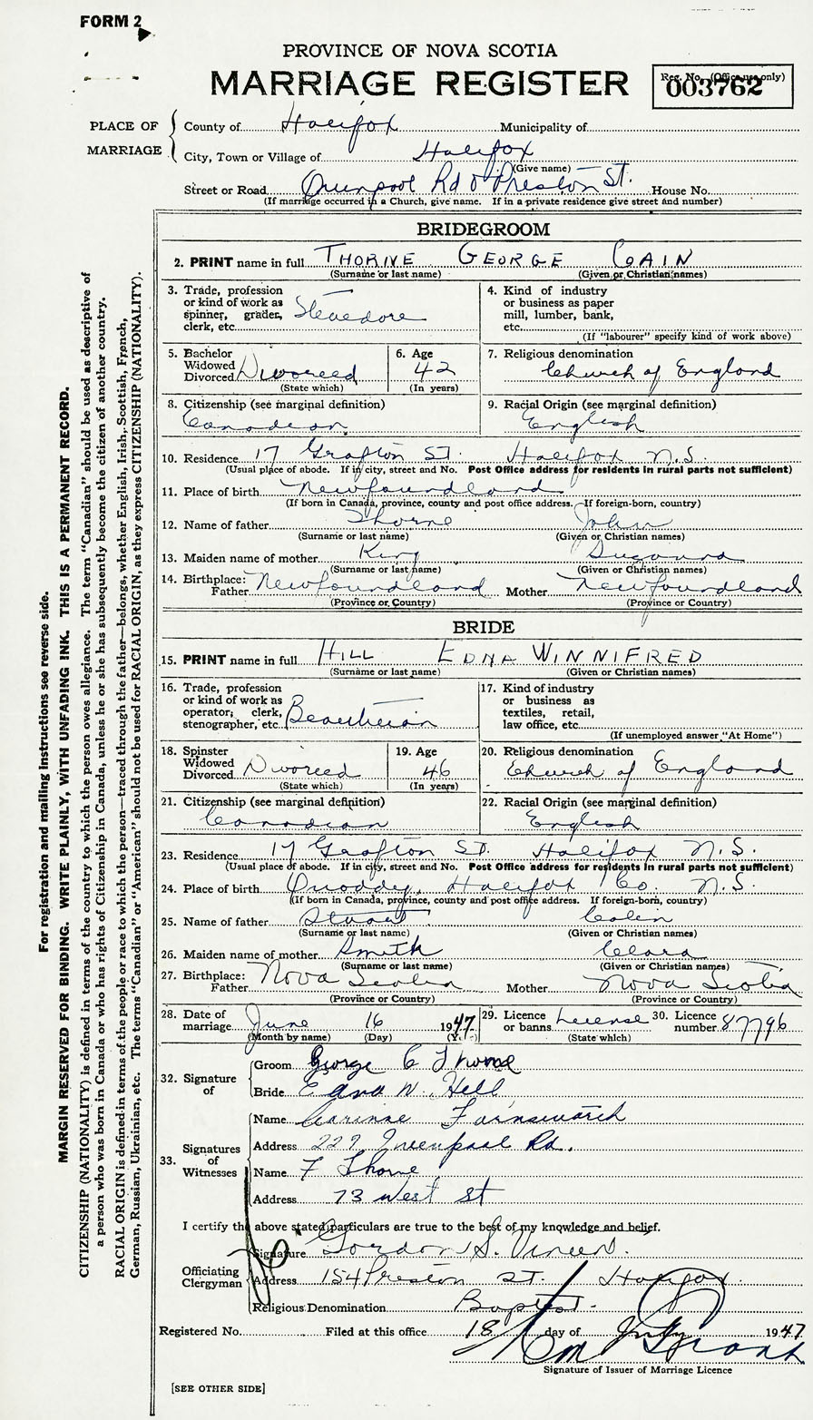 28. Date of marriage June 16 1947 29. By license or banns License 30. License number 87796