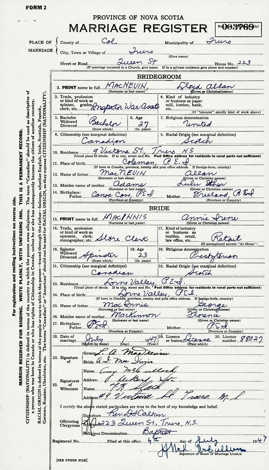 28. Date of marriage July 1 1947 29. By license or banns License 30. License number 88027