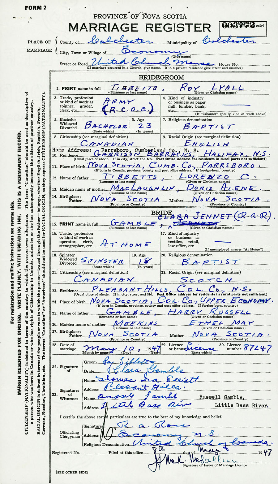 28. Date of marriage May 10 1947 29. By license or banns License 30. License number 87247