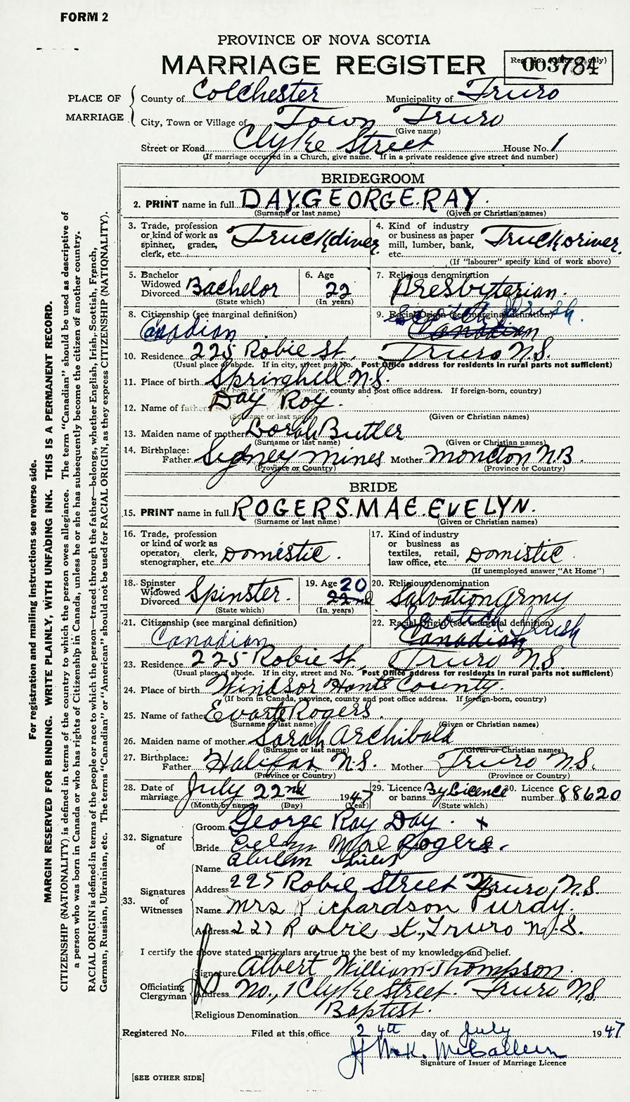 28. Date of marriage July 22 1947 29. By license or banns License 30. License number 88620