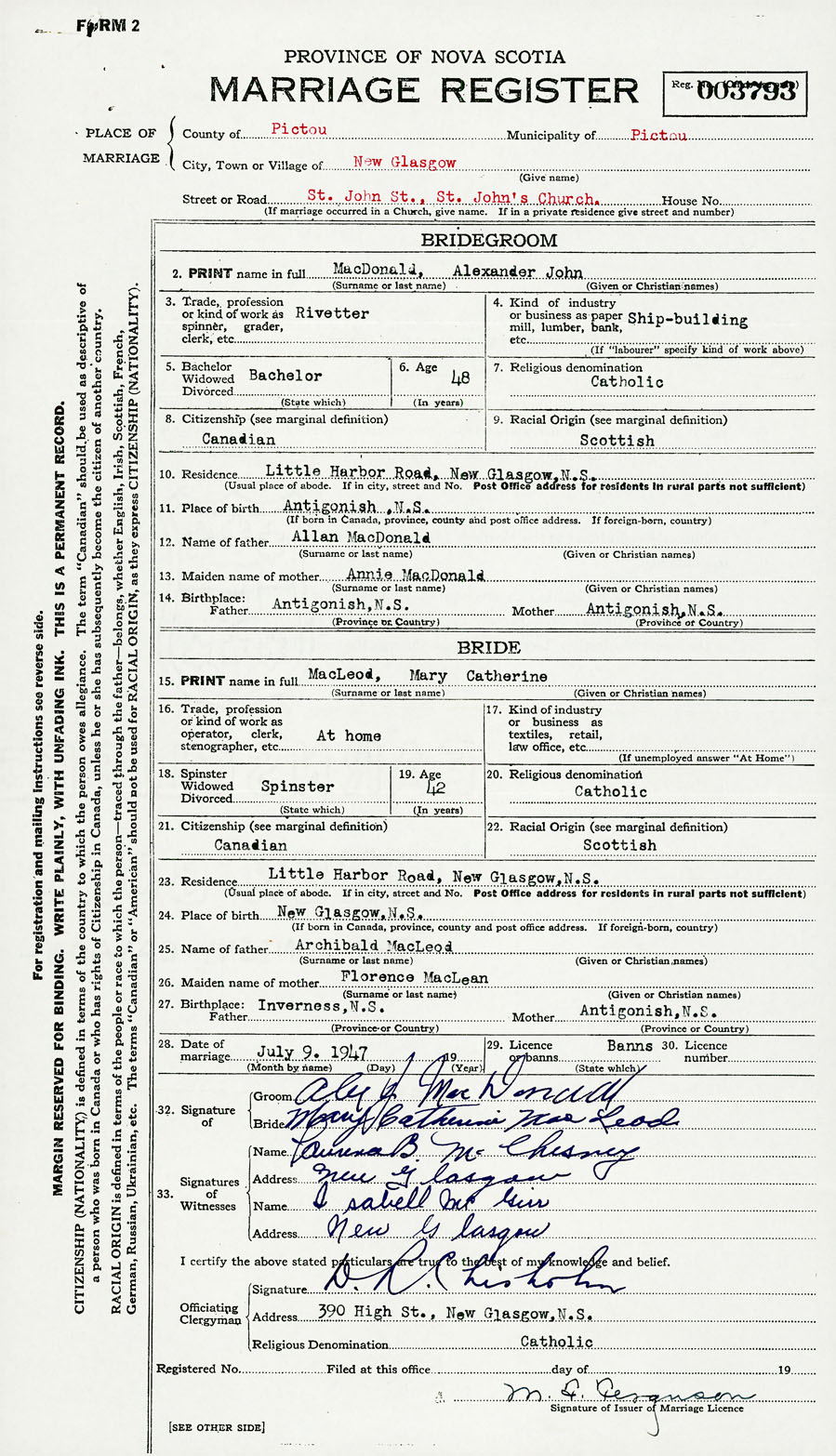 28. Date of marriage July 9 1947 29. By license or banns License 30. License number