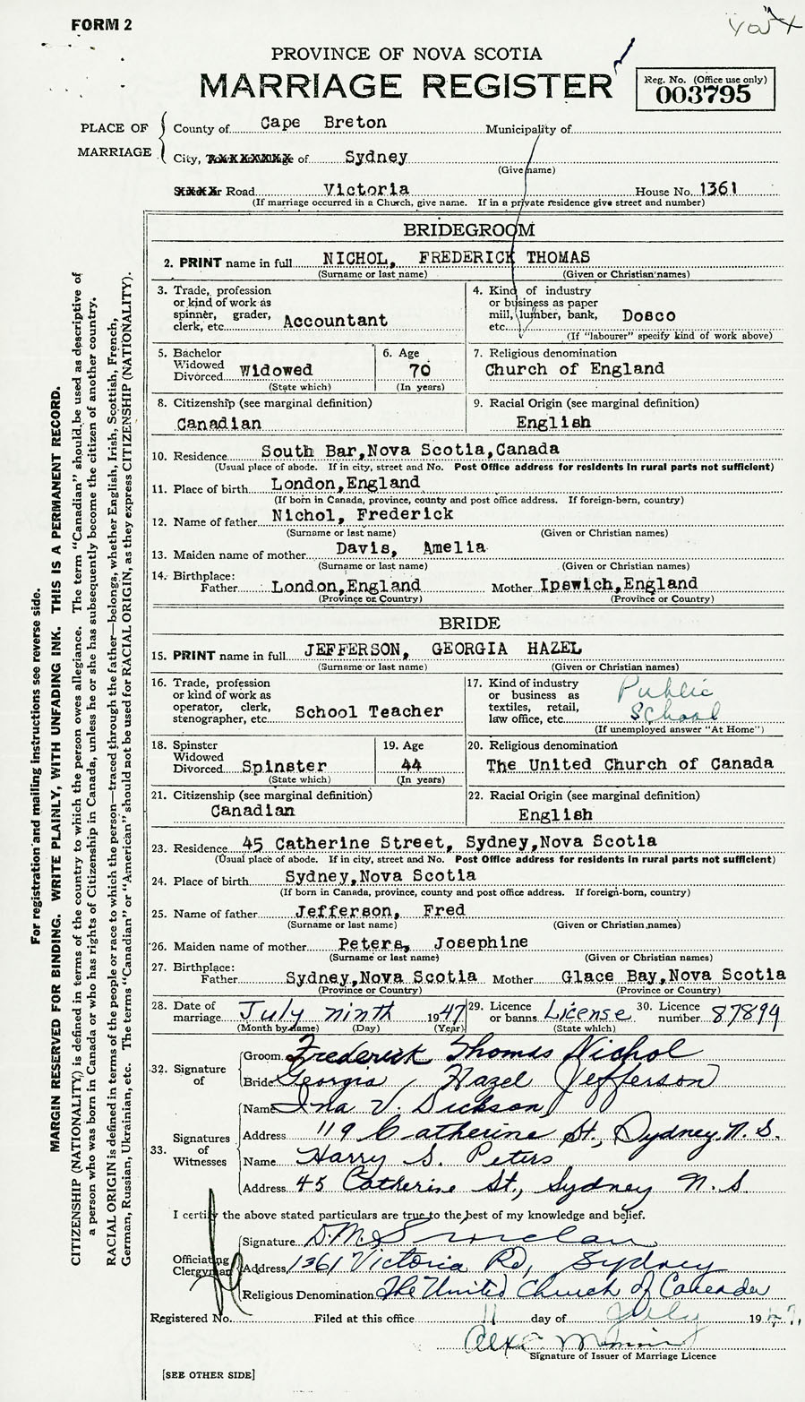 28. Date of marriage July 9 1947 29. By license or banns License 30. License number 87899