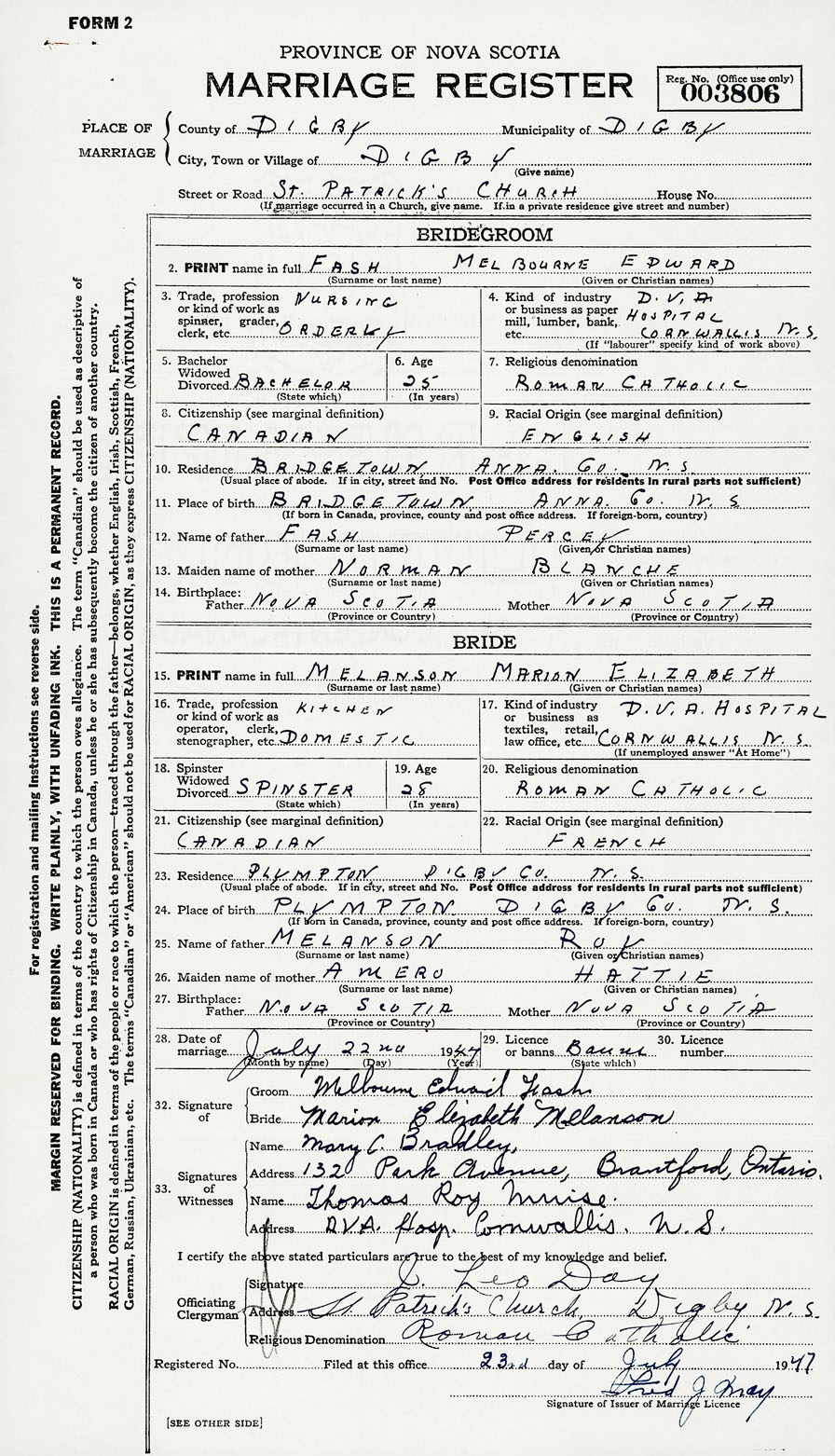 28. Date of marriage July 22 1947 29. By license or banns License 30. License number