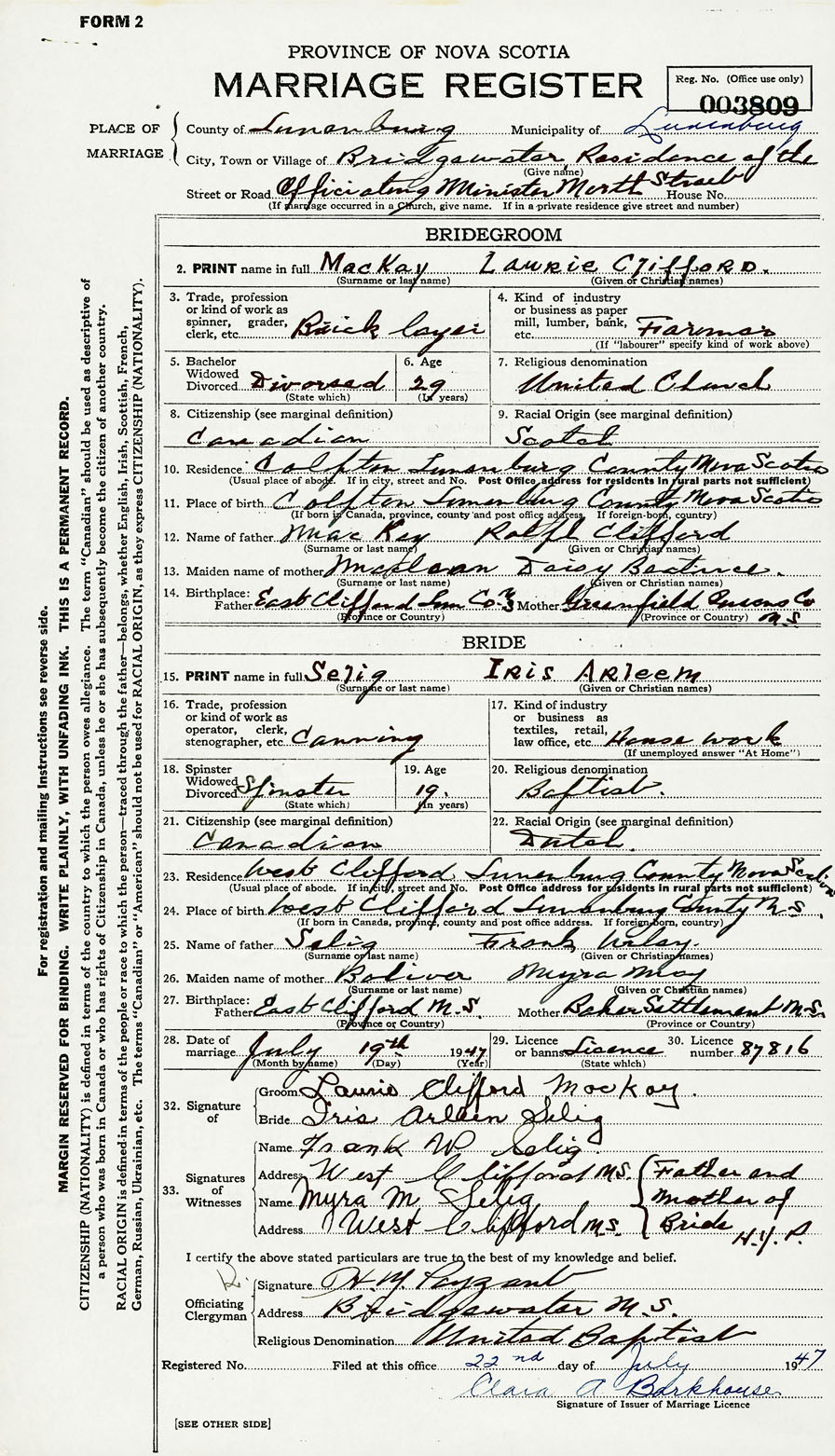 28. Date of marriage July 19 1947 29. By license or banns License 30. License number 87816