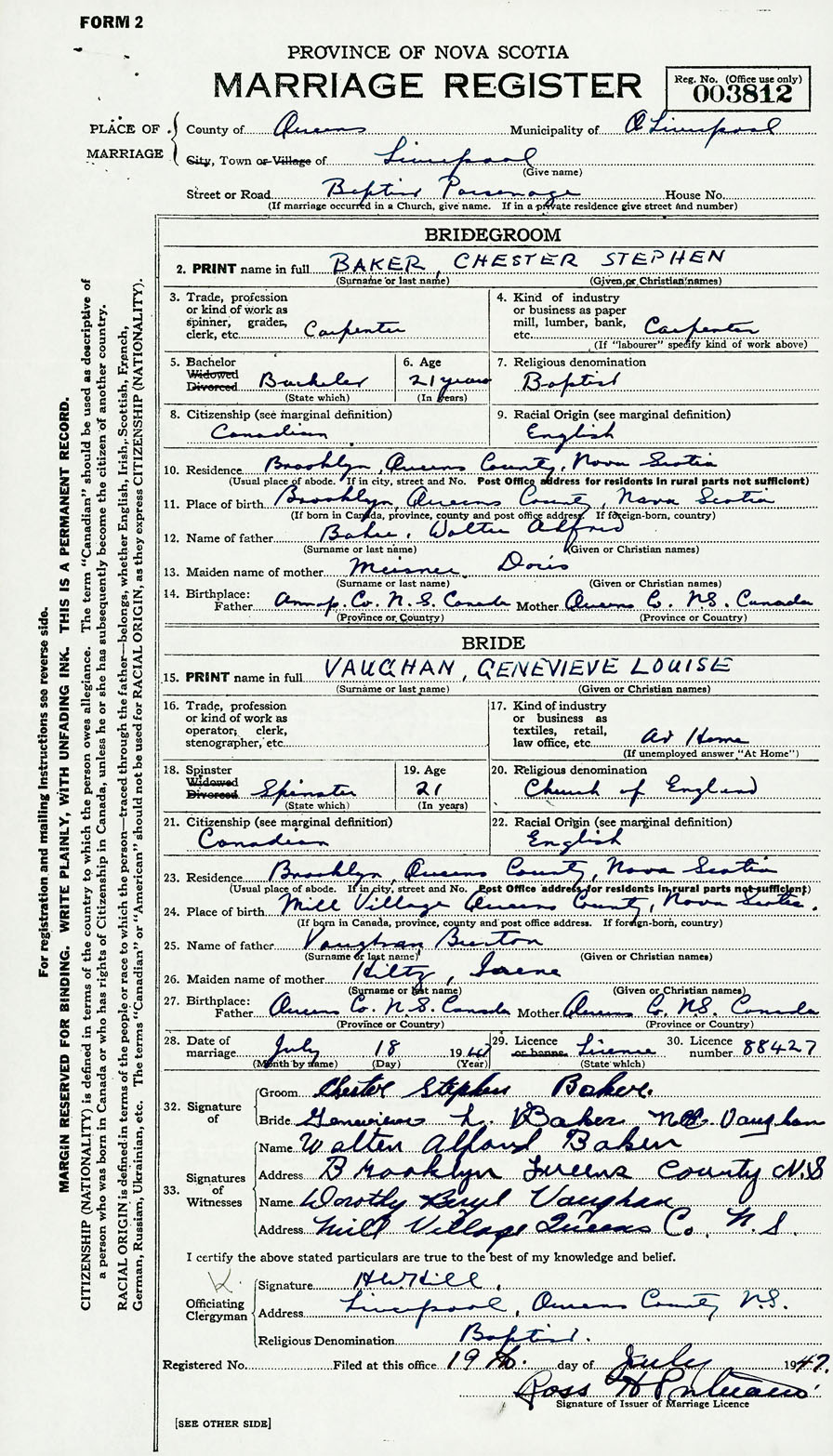 28. Date of marriage July 18 1947 29. By license or banns License 30. License number 88427