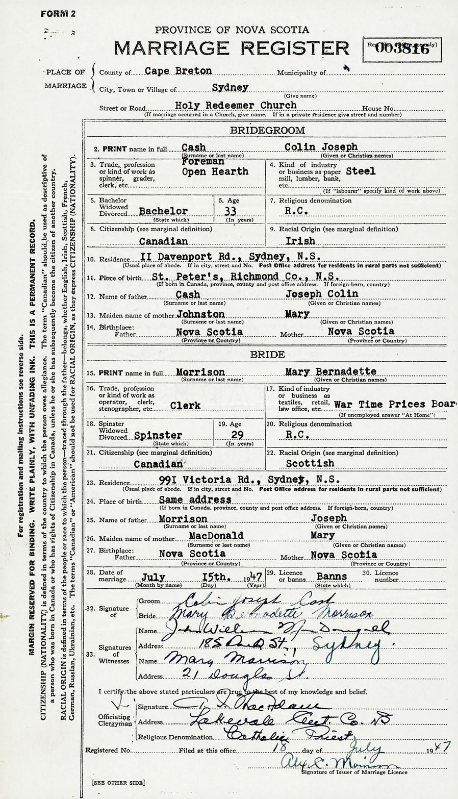 28. Date of marriage July 15 1947 29. By license or banns License 30. License number