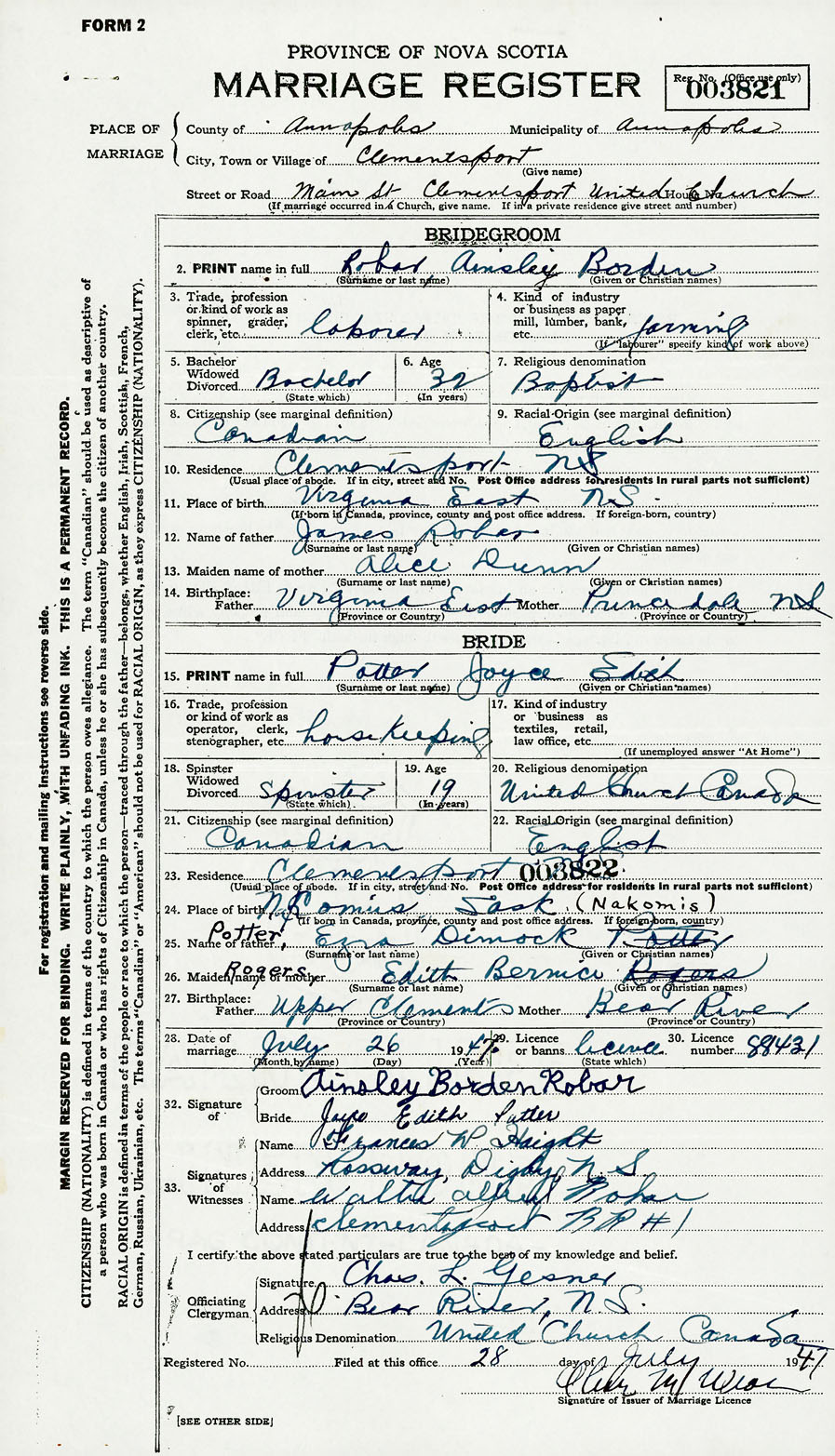 28. Date of marriage July 26 1947 29. By license or banns License 30. License number 88431