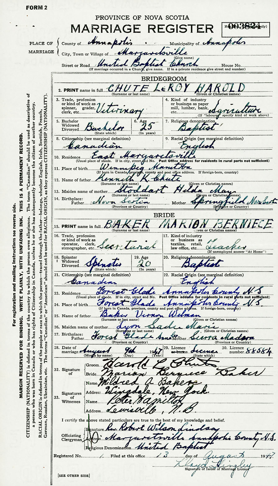 24. Place of birth Forest Glade, Annapolis County, Nova Scotia