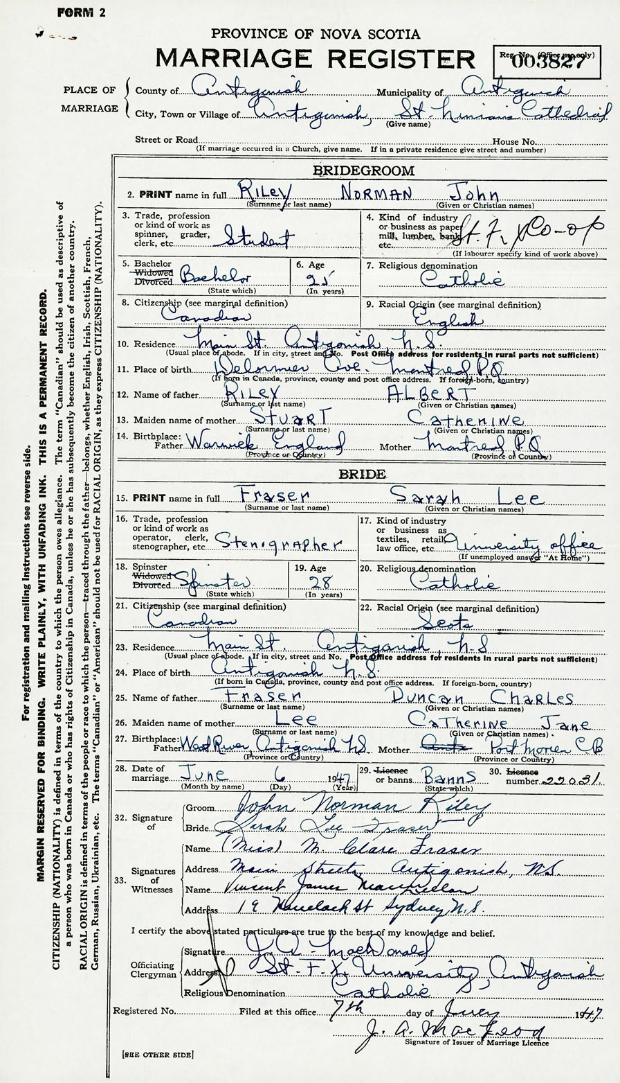 28. Date of marriage June 6 1947 29. By license or banns License 30. License number 22031