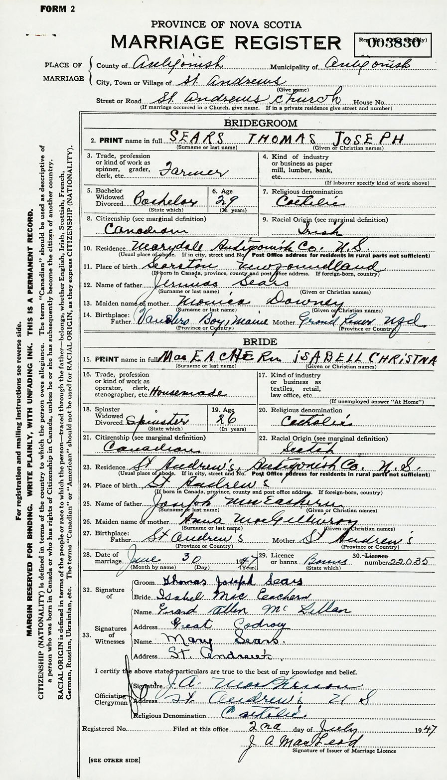 28. Date of marriage June 30 1947 29. By license or banns License 30. License number 22035