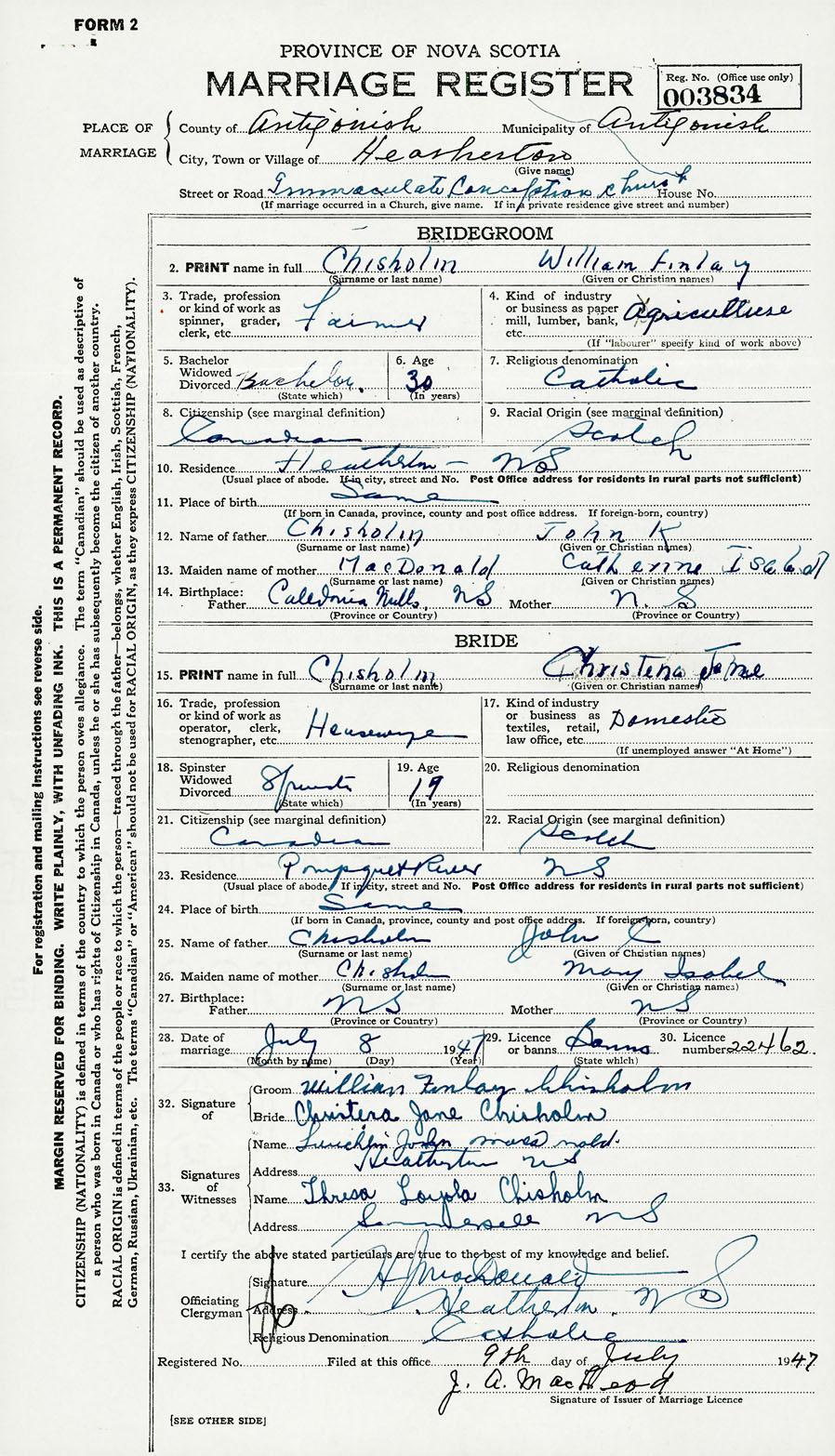 28. Date of marriage July 8 1947 29. By license or banns License 30. License number 22462