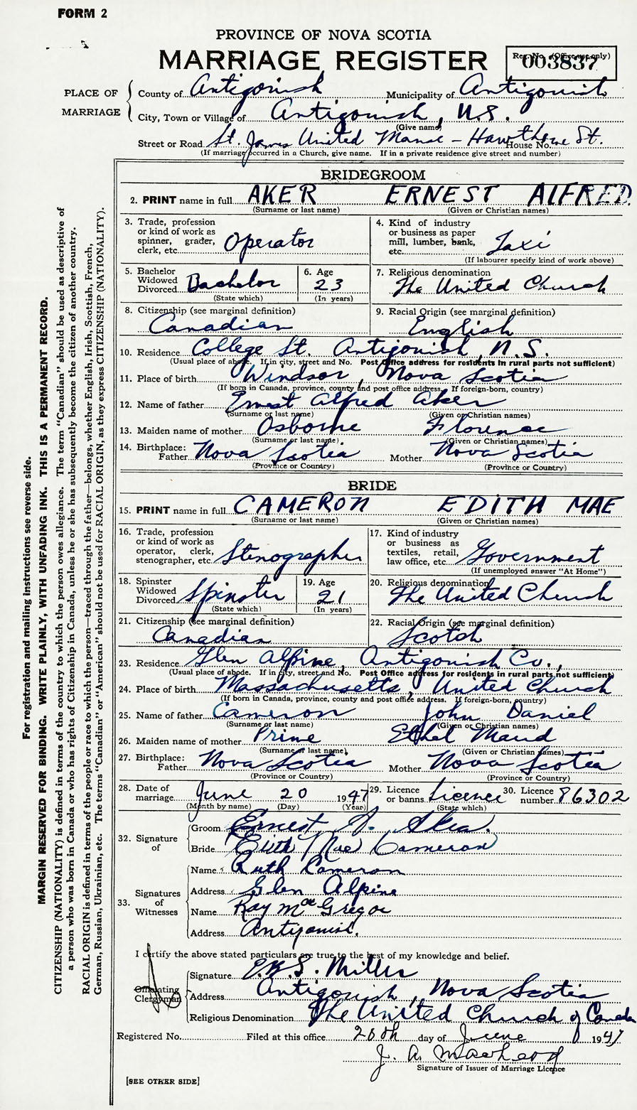 28. Date of marriage June 20 1947 29. By license or banns License 30. License number 86302