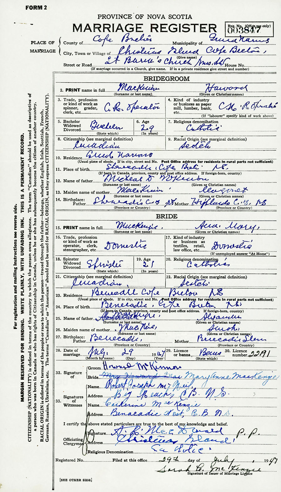 28. Date of marriage July 29 1947 29. By license or banns License 30. License number
