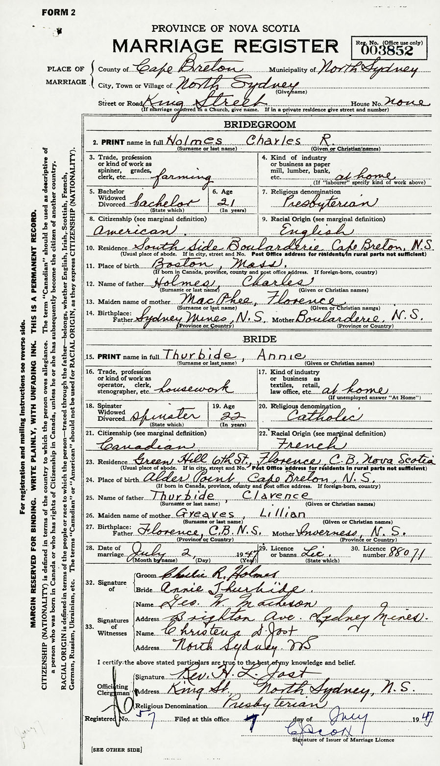 14. Birthplace Father Sydney Mines, Cape Breton County, Nova Scotia Mother Boularderie, Victoria County, Nova Scotia