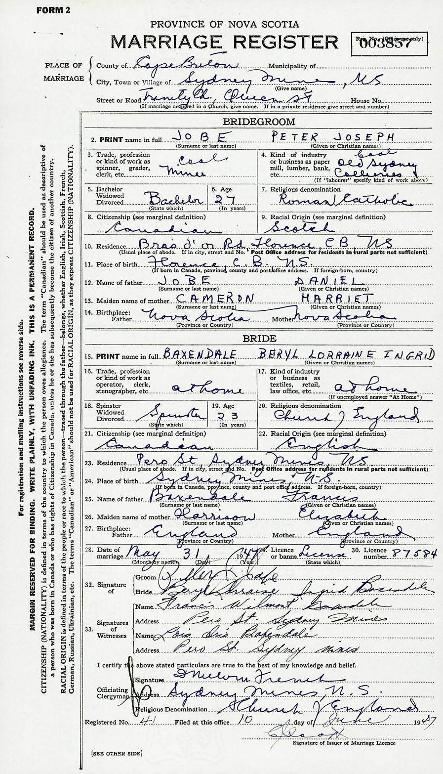 28. Date of marriage May 31 1947 29. By license or banns License 30. License number 87584
