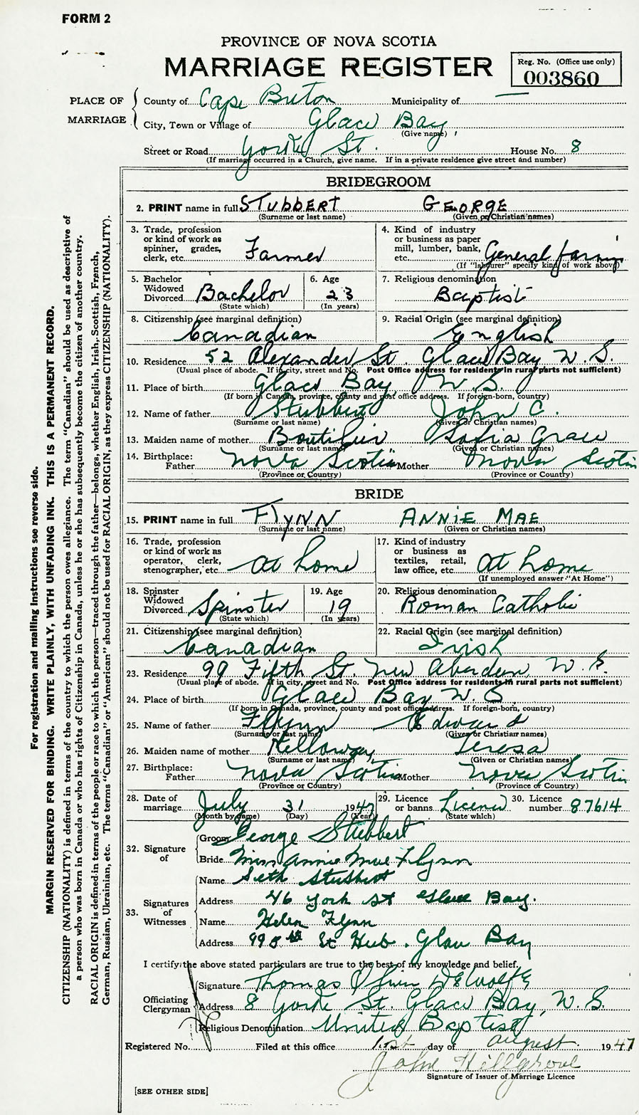 28. Date of marriage July 31 1947 29. By license or banns License 30. License number 87614