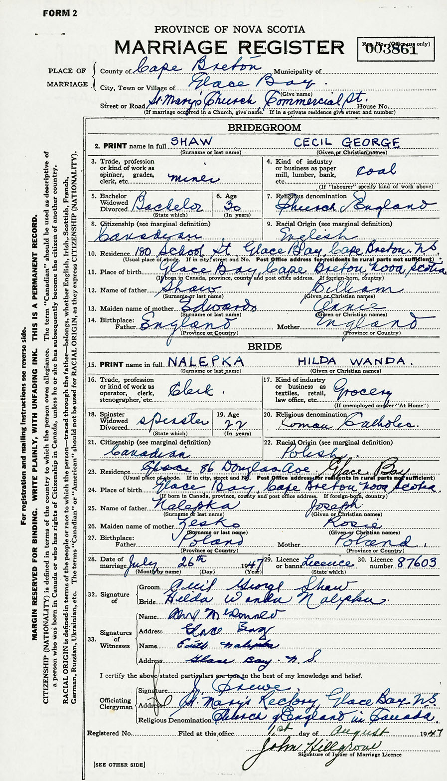 28. Date of marriage July 26 1947 29. By license or banns License 30. License number 87603