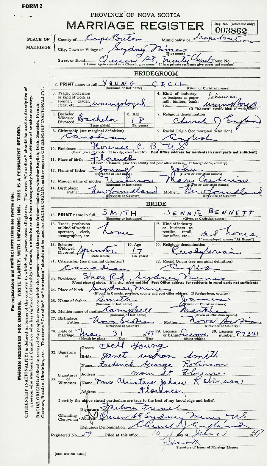 28. Date of marriage May 31 1947 29. By license or banns License 30. License number 87341