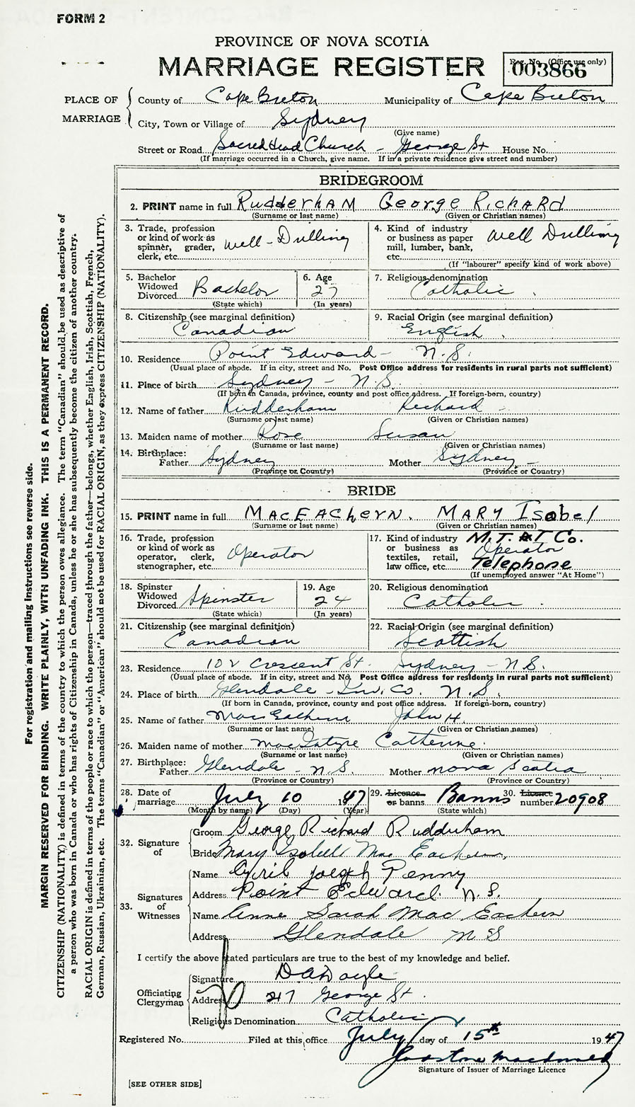 28. Date of marriage July 10 1947 29. By license or banns License 30. License number