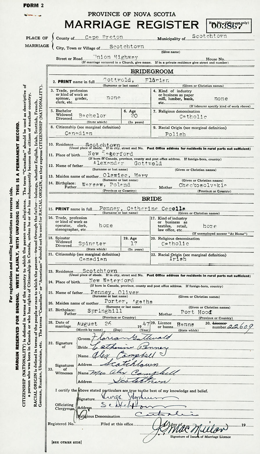 PLACE OF MARRIAGE County of Cape Breton