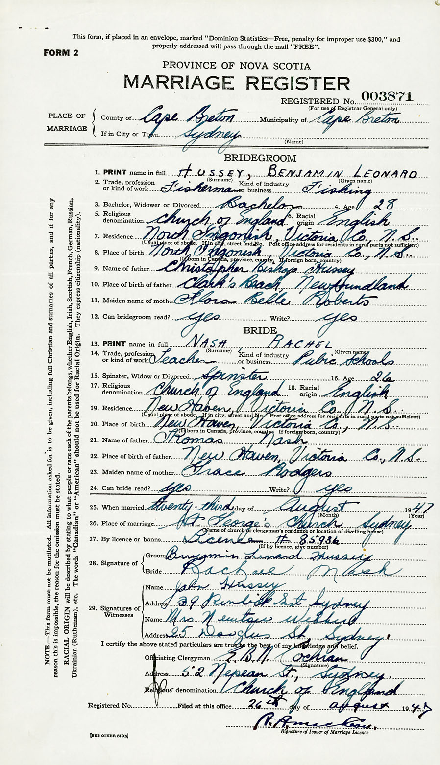 PLACE OF MARRIAGE County of Cape Breton in City or Town Sydney