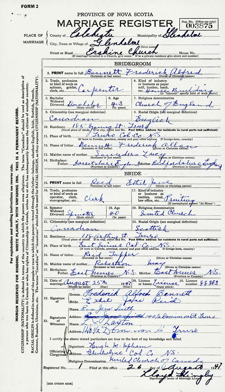 28. Date of marriage August 25 1947 29. By license or banns License 30. License number 88883