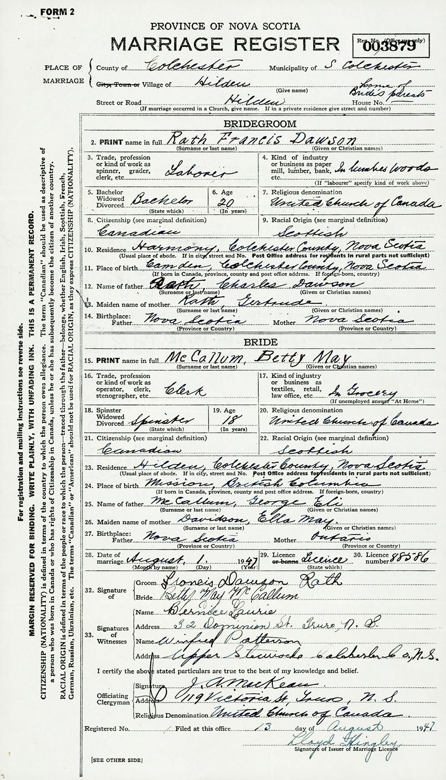 28. Date of marriage August 1 1947 29. By license or banns License 30. License number 88586