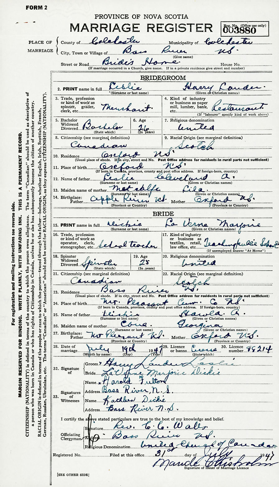 28. Date of marriage July 19 1947 29. By license or banns License 30. License number 89214