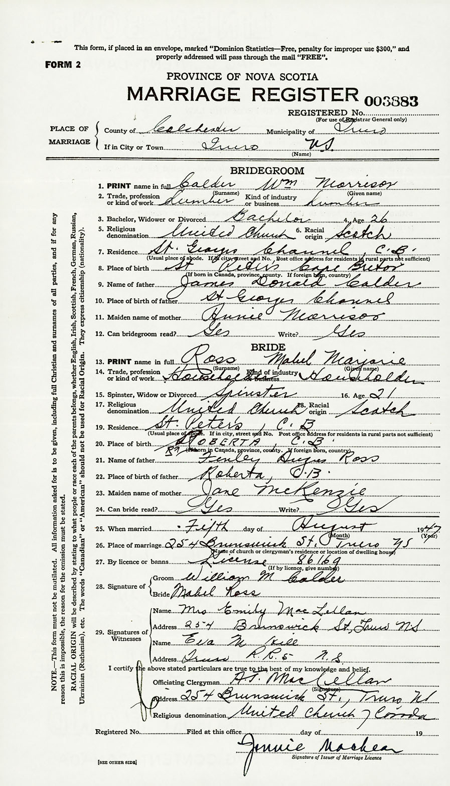 26. Place of marriage 254 Brunswick St. Truro, Colchester County