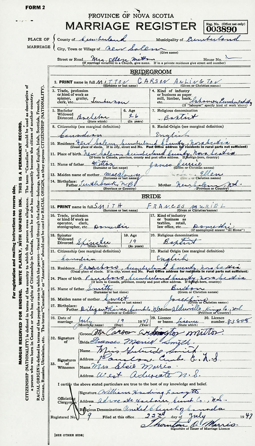 28. Date of marriage July 19 1947 29. By license or banns License 30. License number 83808