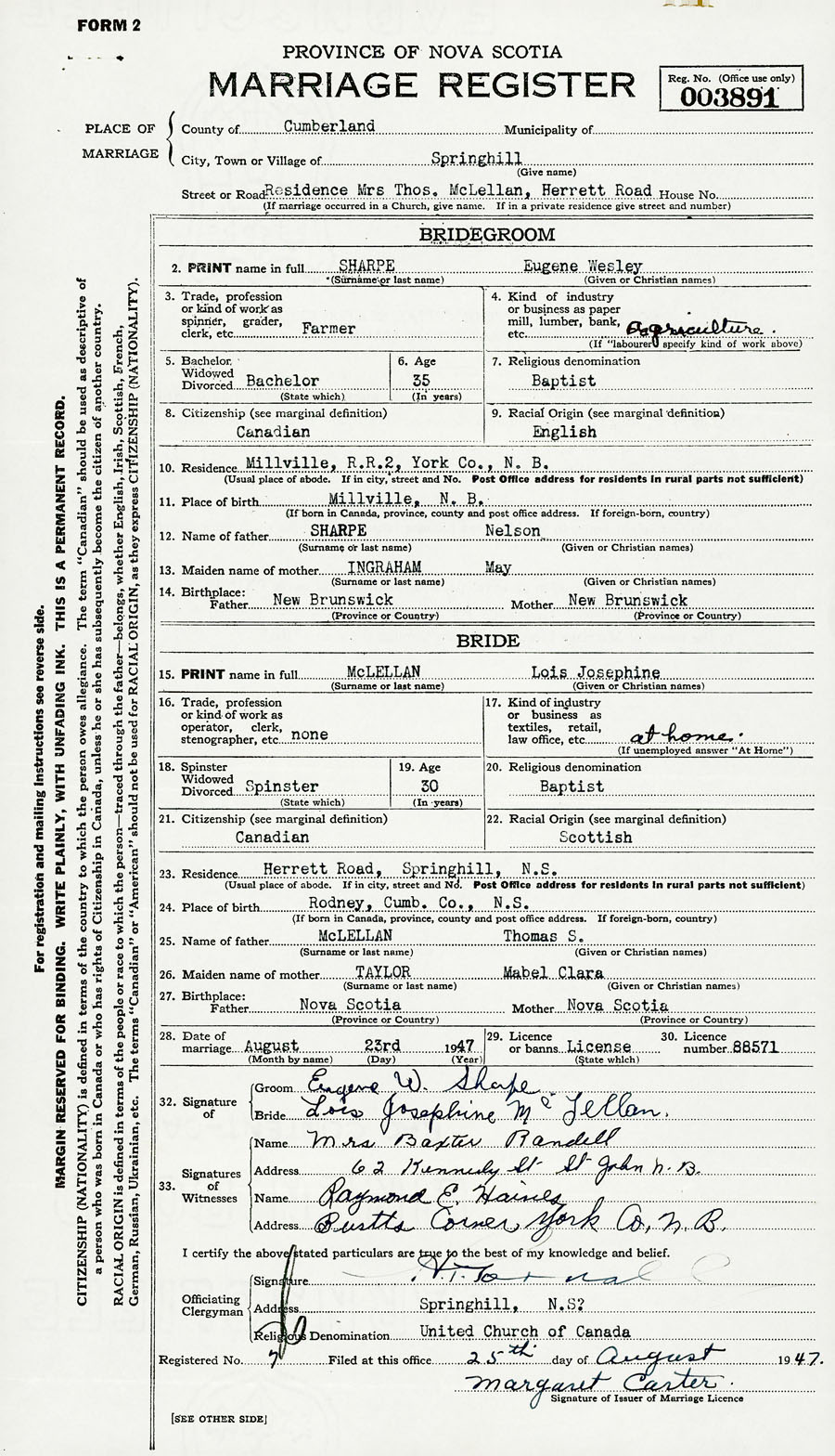 28. Date of marriage August 23 1947 29. By license or banns License 30. License number 88571