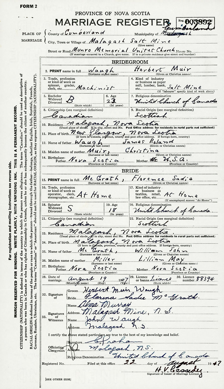 28. Date of marriage August 19 1947 29. By license or banns License 30. License number 88394