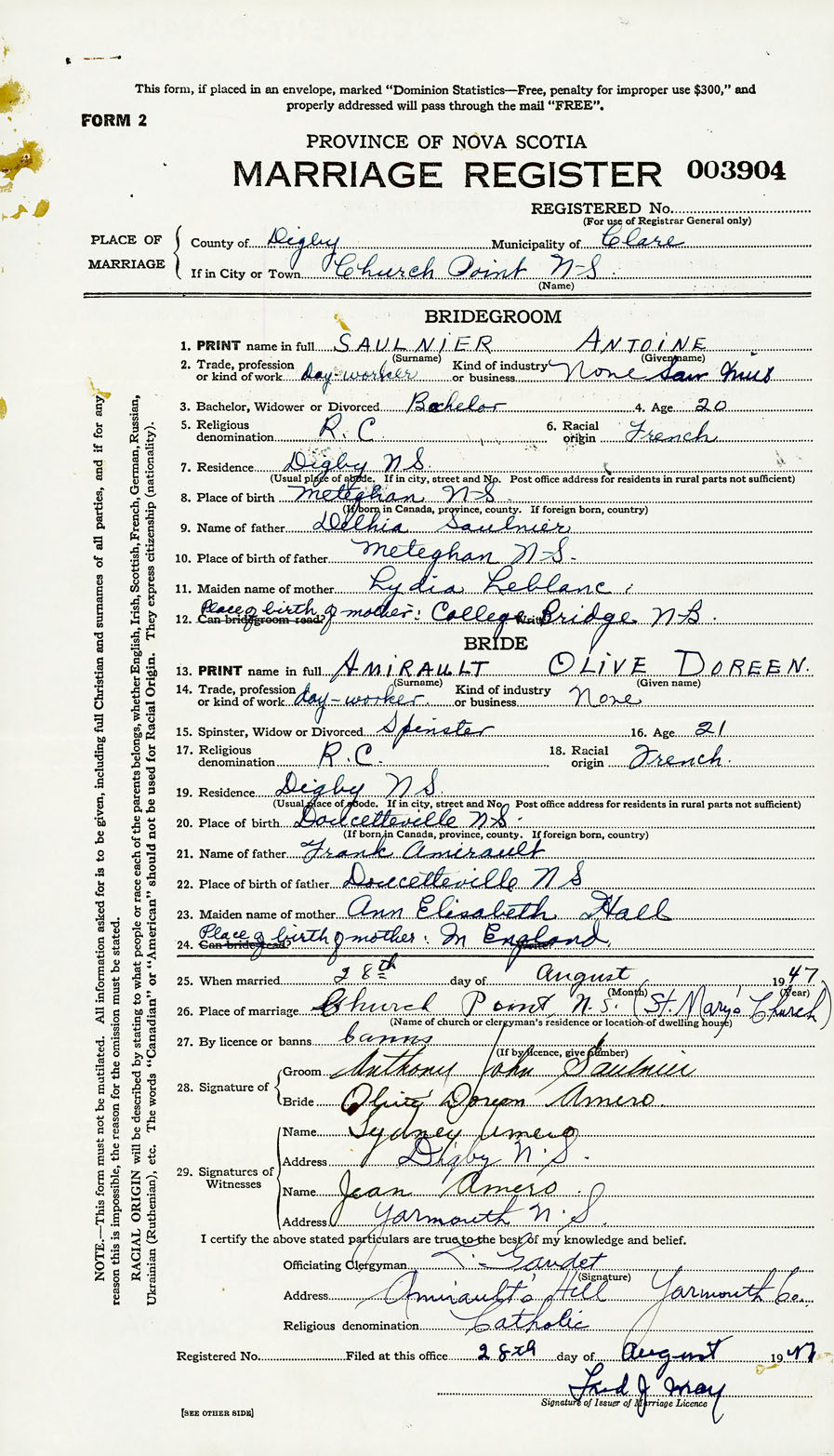 PLACE OF MARRIAGE County of Digby in City or Town Church Point
