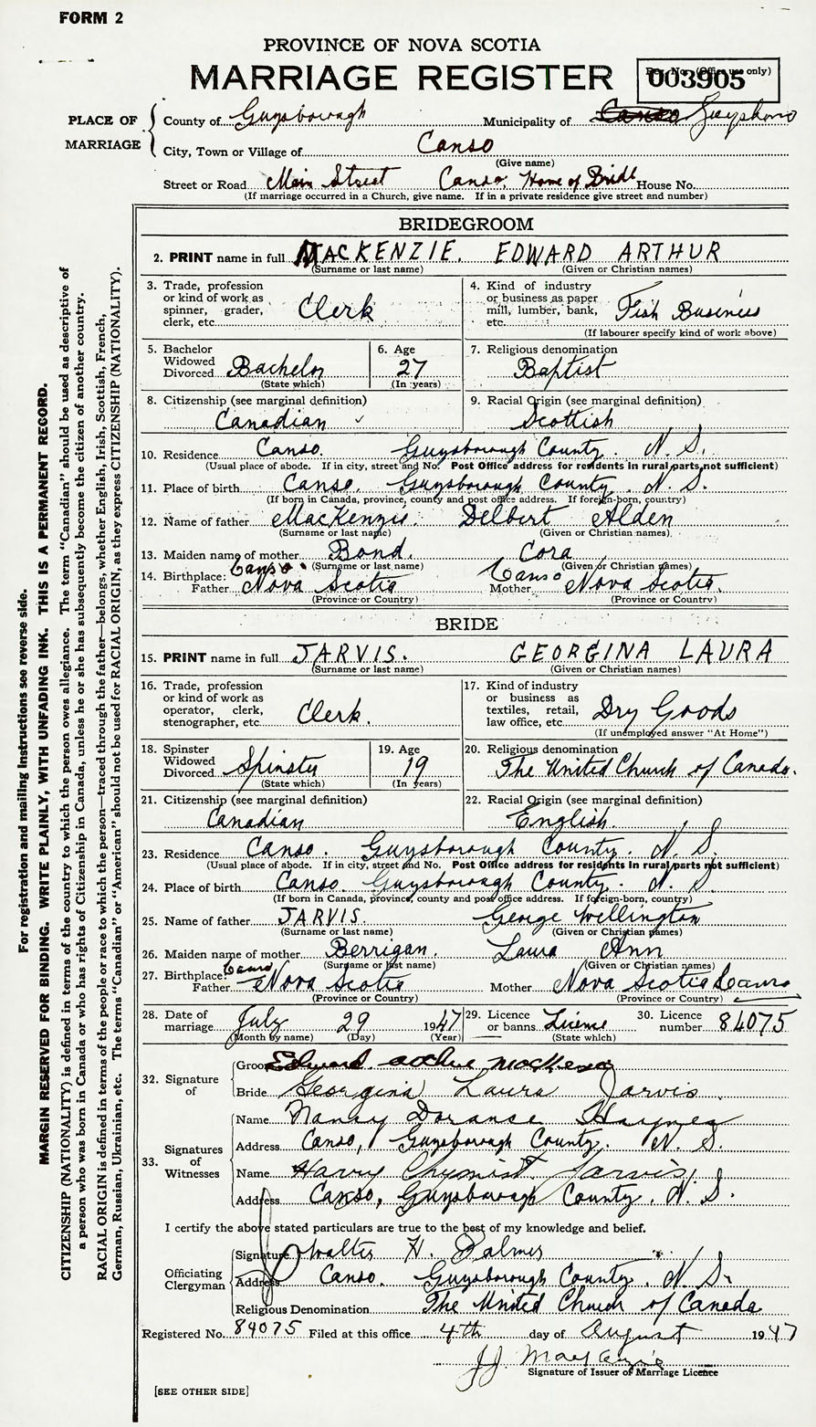 24. Place of birth Canso, Guysborough County, Nova Scotia