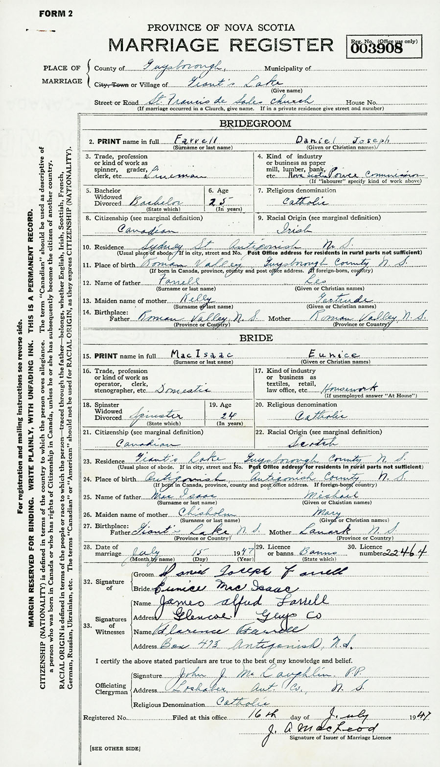 28. Date of marriage July 15 1947 29. By license or banns License 30. License number 22464