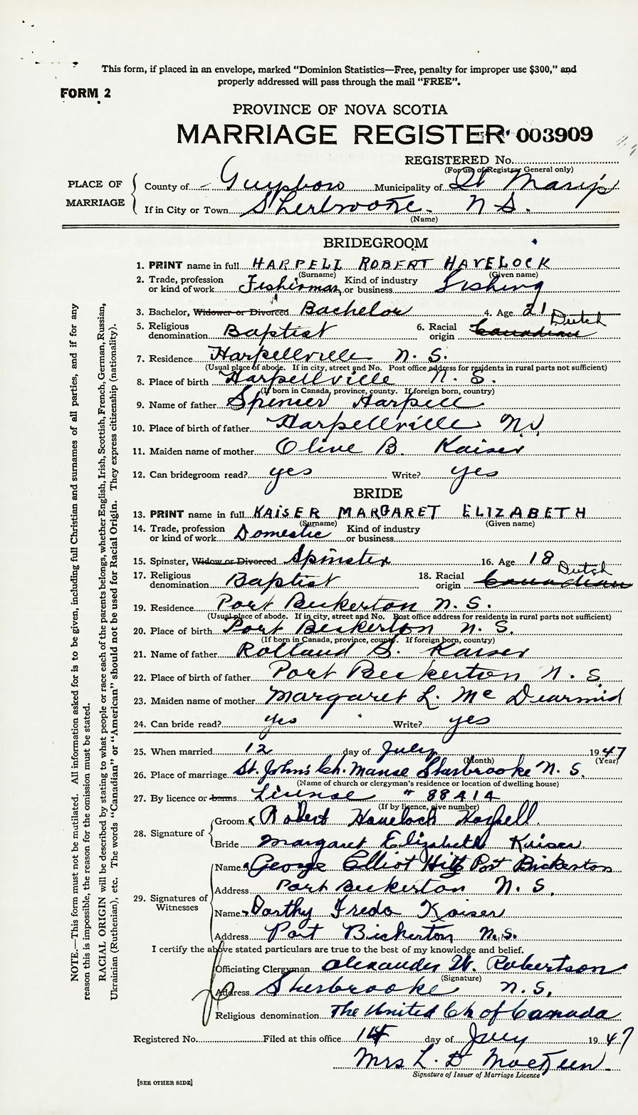 PLACE OF MARRIAGE County of Guysborough in City or Town Sherbrooke