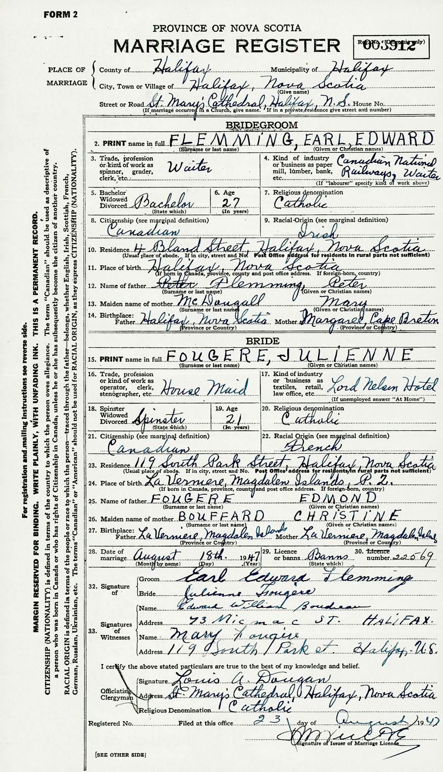 28. Date of marriage August 18 1947 29. By license or banns License 30. License number 22569