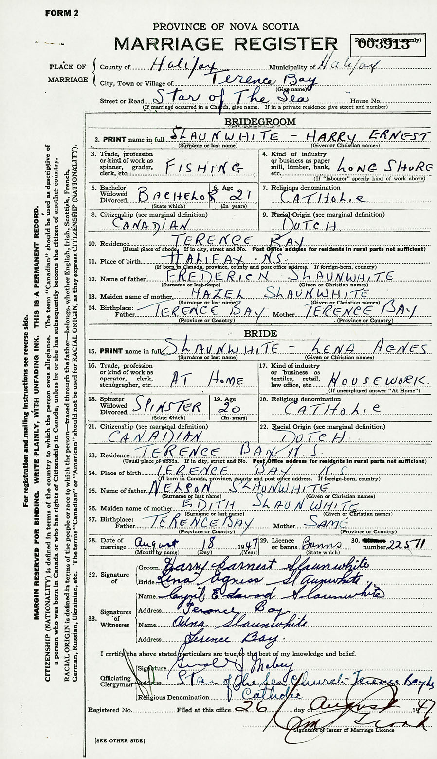 28. Date of marriage August 18 1947 29. By license or banns License 30. License number 22571