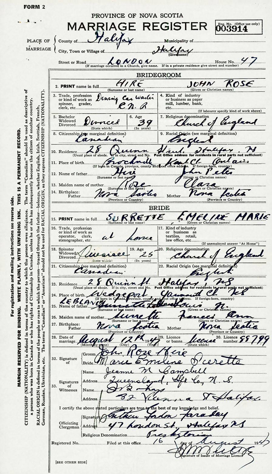 28. Date of marriage August 12 1947 29. By license or banns License 30. License number 88799