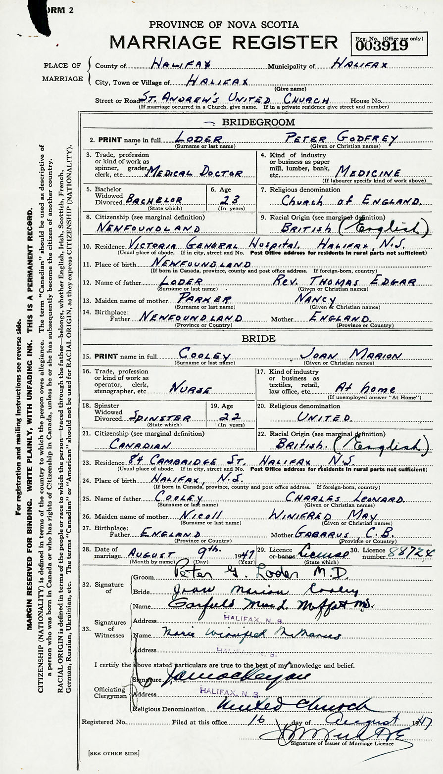 28. Date of marriage August 9 1947 29. By license or banns License 30. License number 88724
