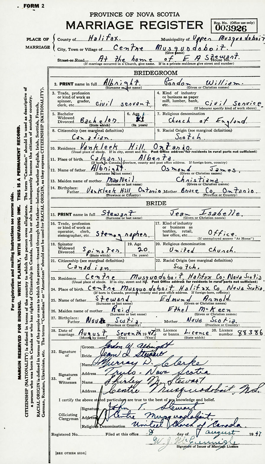 28. Date of marriage August 7 1947 29. By license or banns License 30. License number 88386