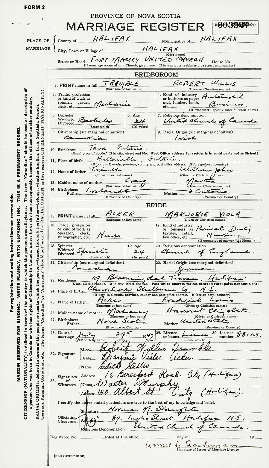 28. Date of marriage July 29 1947 29. By license or banns License 30. License number 88103