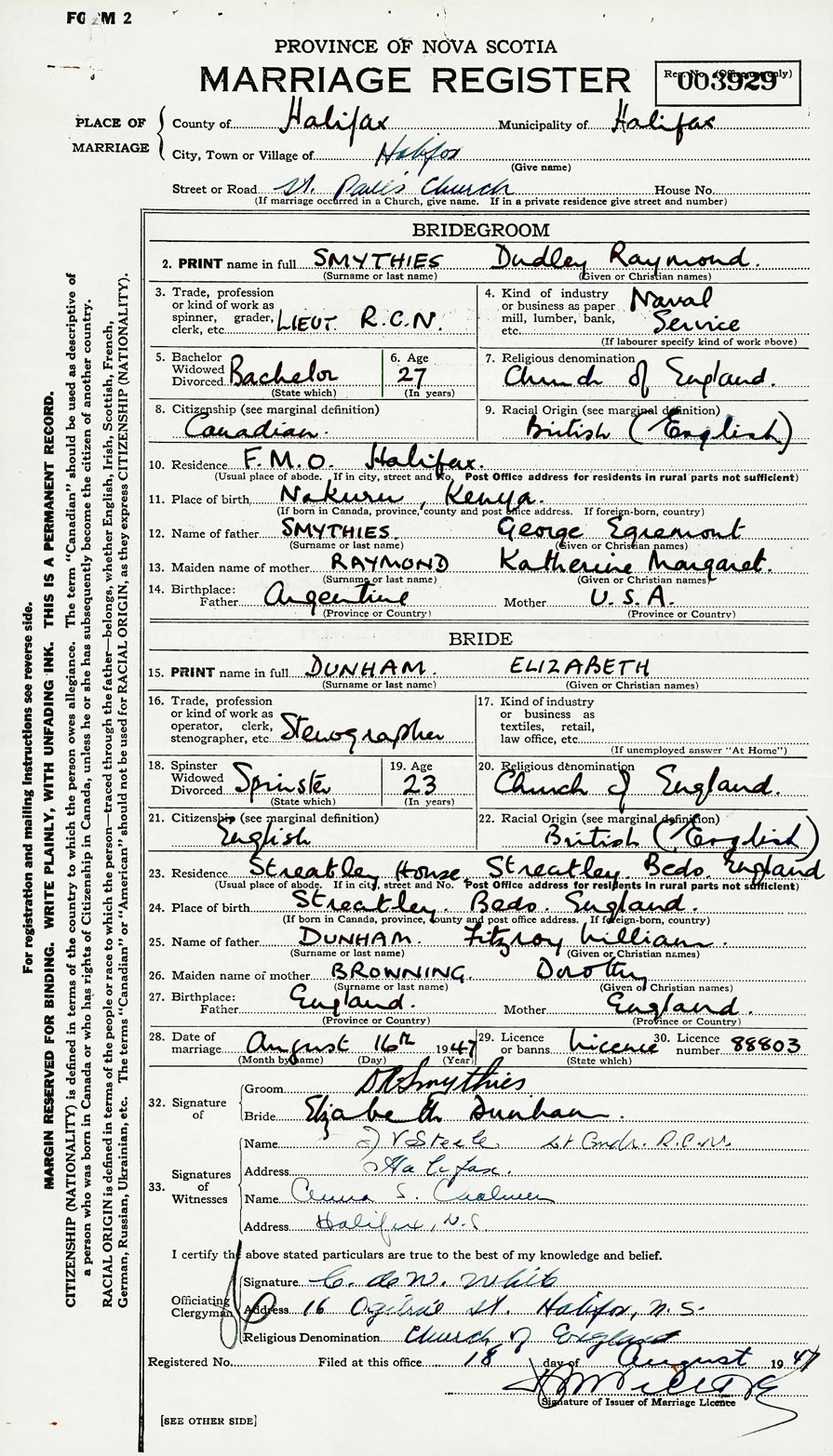 28. Date of marriage August 16 1947 29. By license or banns License 30. License number 88803