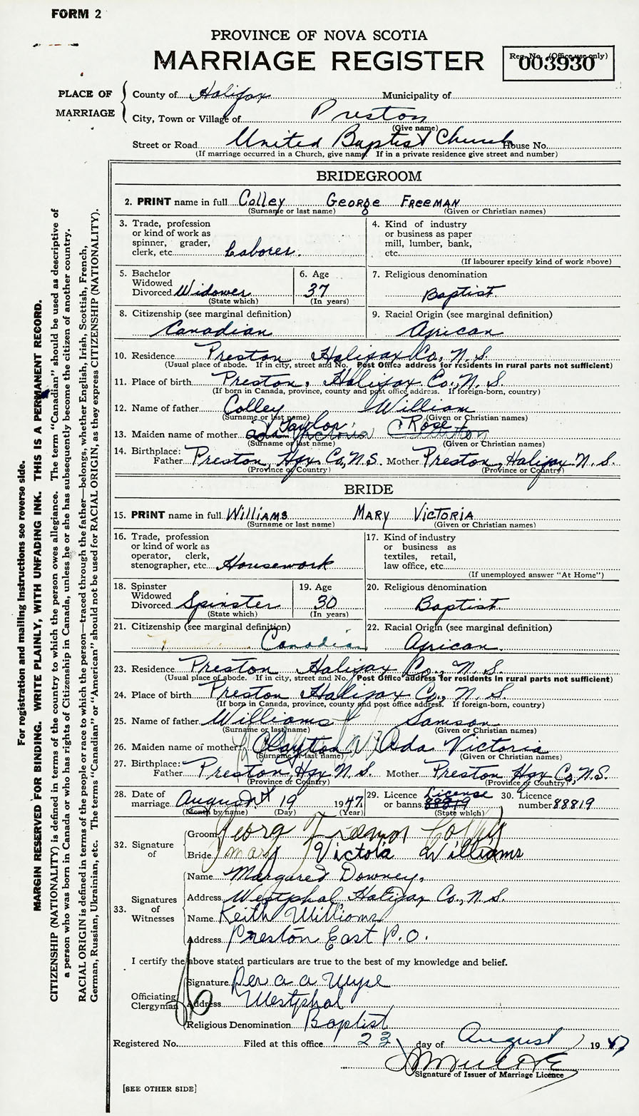 24. Place of birth Preston, Halifax County, Nova Scotia